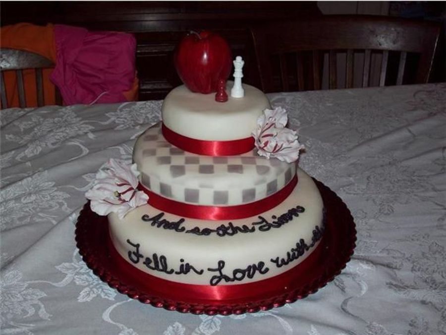 3 tier French Vanilla, Lemon, and Strawberry, BC and covered in MMF. 16th birthday cake for my niece. Based off of the covers of the Twilight series books. A HUGE thanks to Jeanne (jkalman) for helping me out with the Tulips. The bottom tier says... "And so the Lion fell in Love with the Lamb." a quote from the first book.