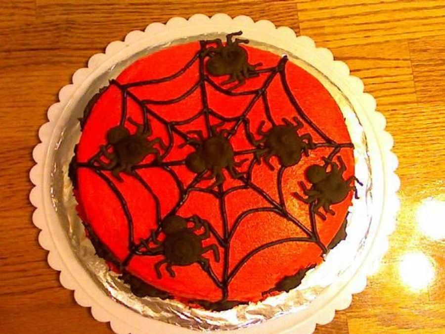 This is a 9" round devil's food 2-layer cake with Snickers Bar Frosting. The icing is buttercream made from scratch tinted with orange gel coloring. The spiders are hand-piped and made with homemade chocolate royal icing. Everyone at the party loved it and said it was too perfect to cut into.