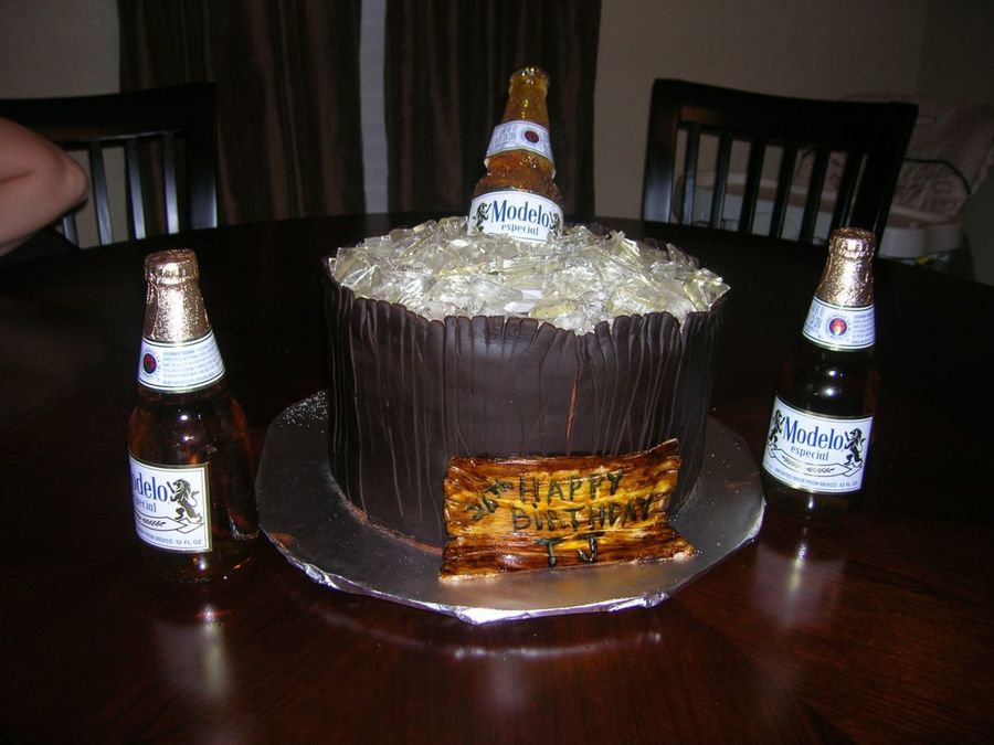 Chocolate buttercream, fondant, sugar ice/bottle. 2 other bottles are real.