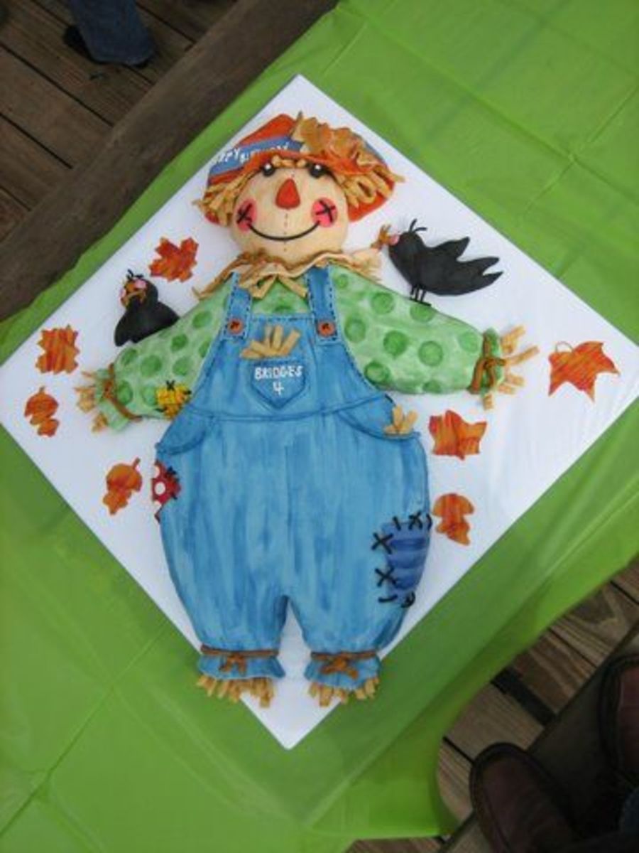 Used a large sheet cake pan and carved out design for body. Use half ball pan for head. The crows are made with rice crispy treats. All was covered in rolled fondant.