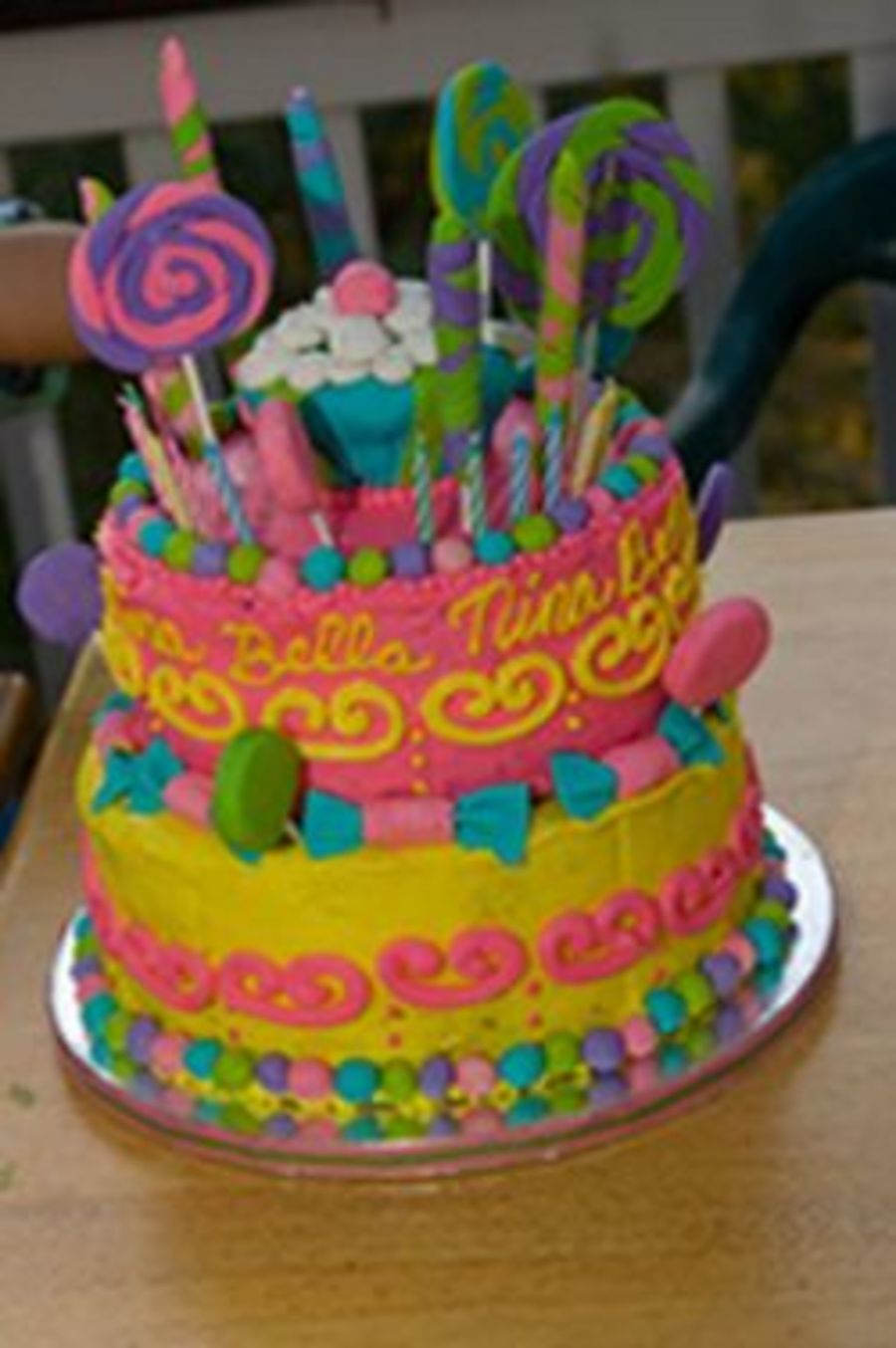 I copied this cake from a cake on this website, by Mary-Anne. I hope she doesn't mind me copying it. It was a lot of fun, but I don't like the way the buttercream looks. I used a powdered sugar recipe and it just wasn't "loose" enough to get smooth, so you can see the chocolate cake through the frosting.
