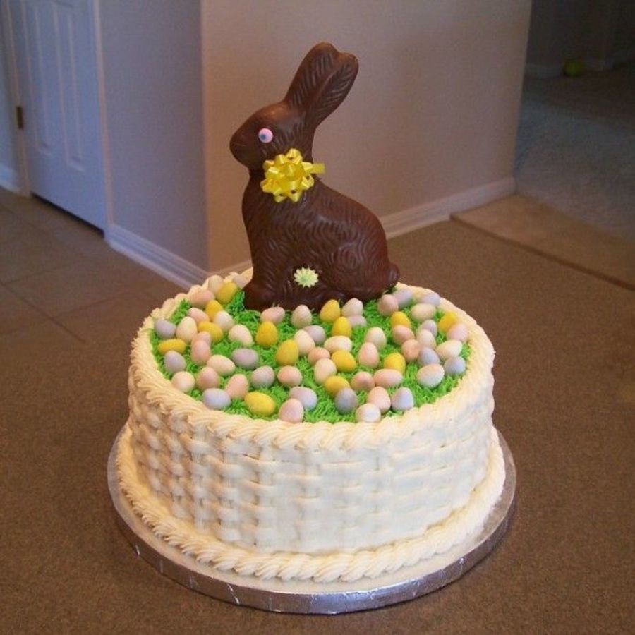 White cake w/raspberry filling. Basketweave and grass are buttercream. Cadbury mini eggs and a chocolate bunny on top.