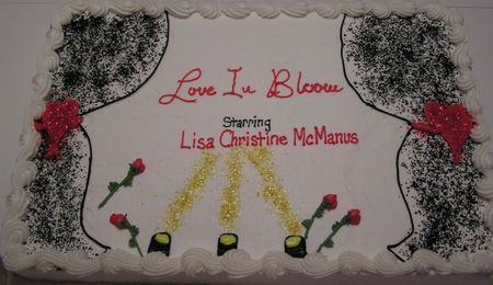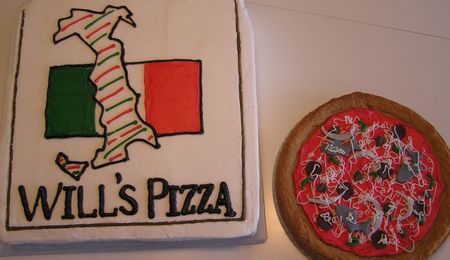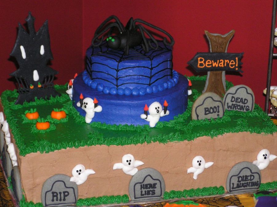 Cake iced in buttercream with cookie graves and tress, fondant and color flow accents.