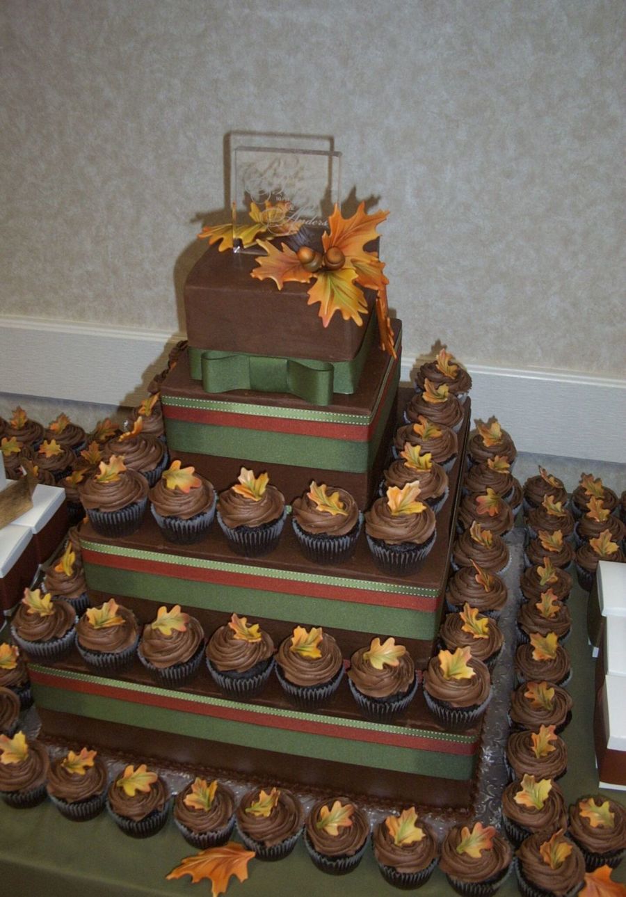 Cupcake stand with ribbons. 6" chocolate topper and cupcakes with orange chocolate buttercream. Handmade fall leaves and acorns out of fondant.