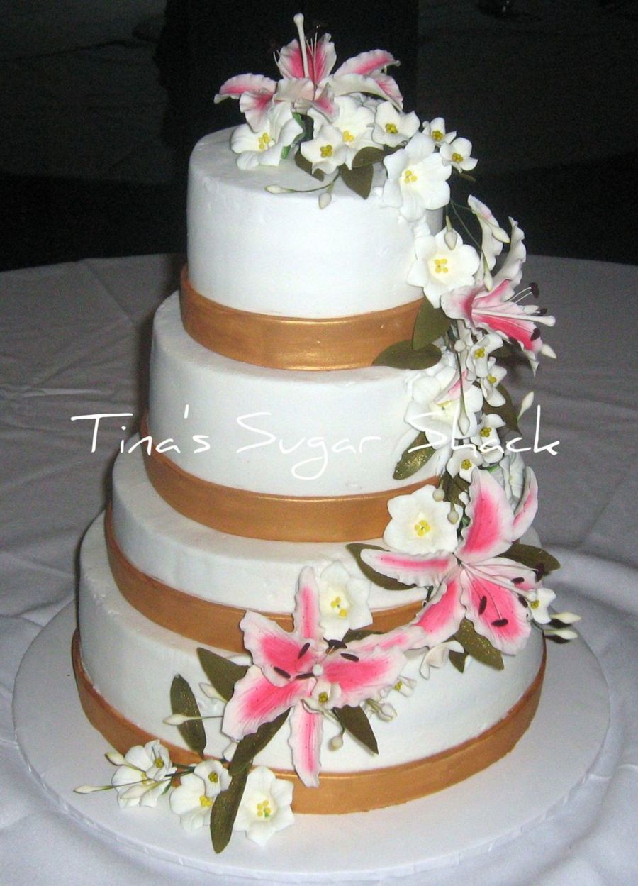 This is a 6",8",10"(only 2" high instead of 4), and 12" rounds stacked and iced in buttercream with fondant ribbon and gumpaste flowers. Thank you so much to confectionaryperfection who gave me a website to give to my customer to get the flowers at the VERY last minute. Everyone was happy with the outcome!