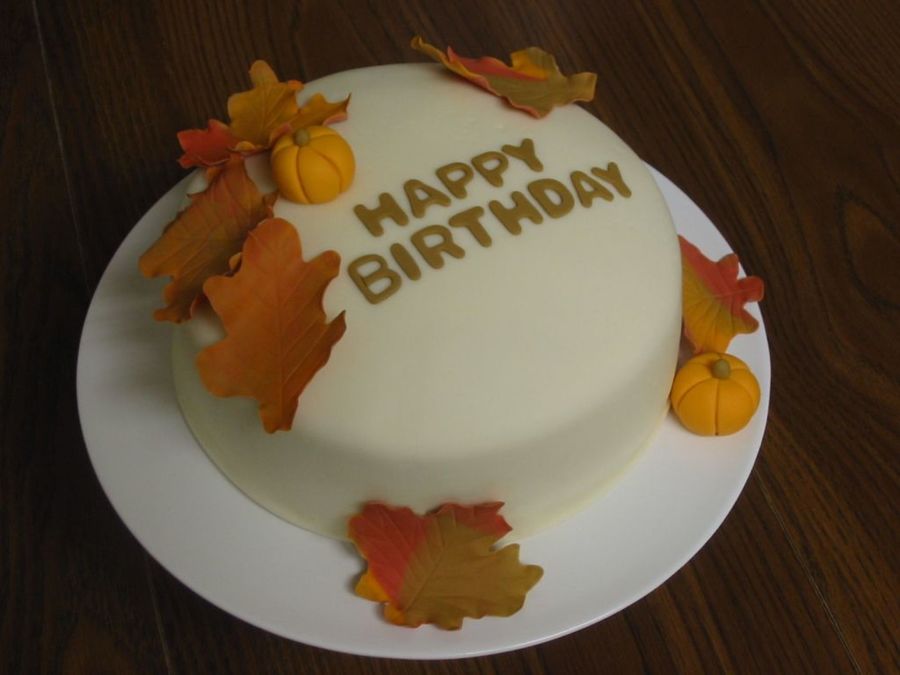 8" applesauce pound cake with vanilla bc, and white chocolate fondant. Gumpaste/fondant leaves & pumpkins. TFL!