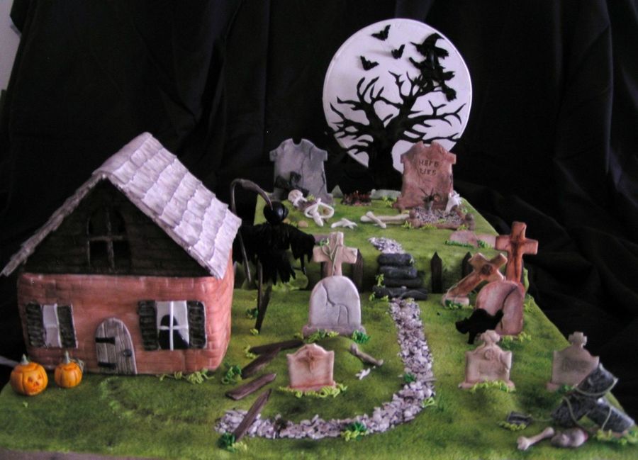 Fondant covered spong haunted house. Sugarpaste graves, bones, bats, rats, tree , moon and grim reaper.....