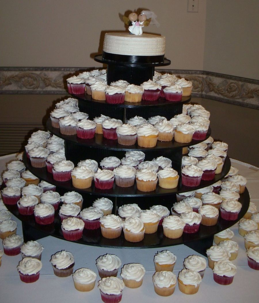 Cupcakes for my friends wedding (chocolate, yellow, and red velvet). The cake on top is yellow with strawberry filling. All buttercream icing. Took forever to bake all those cupcakes!