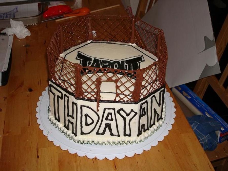 Made this cake for my son's 8th birthday. He is really into ju jitsu and mixed martial arts so he wanted the octagon ring for the fights. Made the "cage" out of chocolate. The cake was white w/ strawberries and b/c. Thanks for looking!