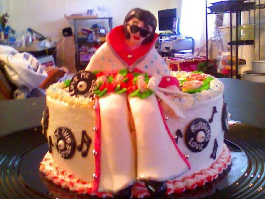Figure is fondant with buttercream rose bouquet. Records are fondant with buttercream. Cake is buttercream with buttercream two-toned roses. Birthday cake for a woman who loves Elvis and roses
