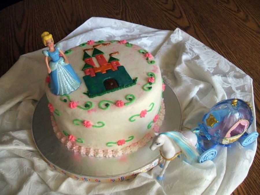 This cake I made for a 7 years old girl's birthday party. It is an 8" , 2 layers vanilla cake, with strawberry filling and cream cheese frosting. The castle is fondant that I painted. The flowers are frosting. The figurines are bought and given by the mother of the birthday girl. Thanks for looking!! :)