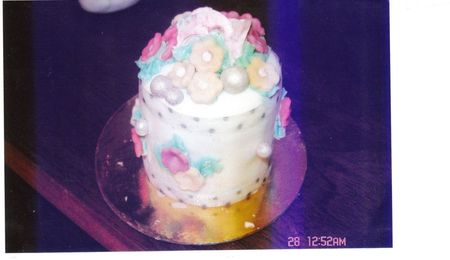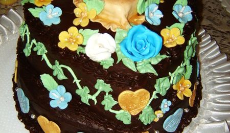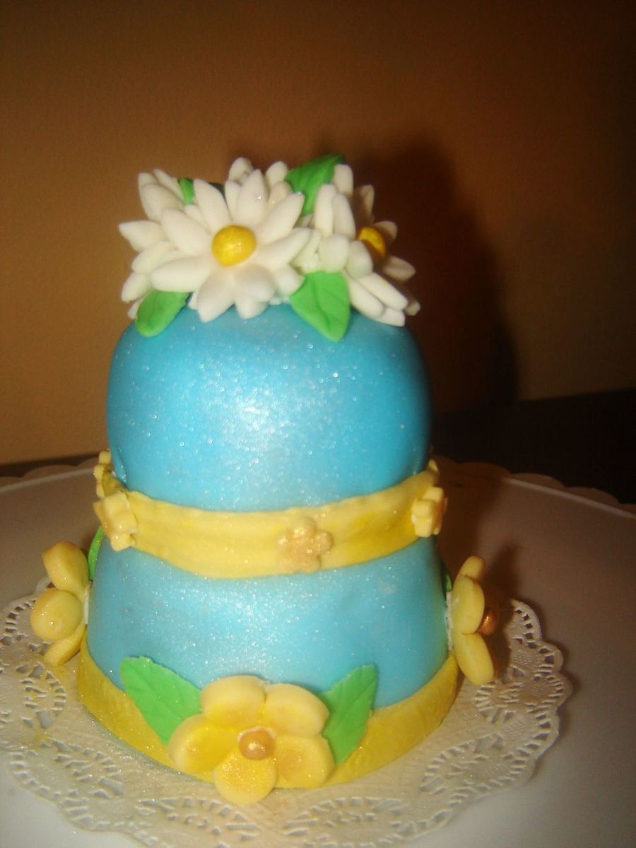 Mini orange cream cake soked with orange liqour,frosted with dark chocolate buttercream and covered with fondant painted in blue. Fondant daisys and decorations.