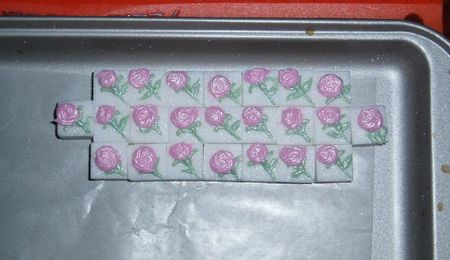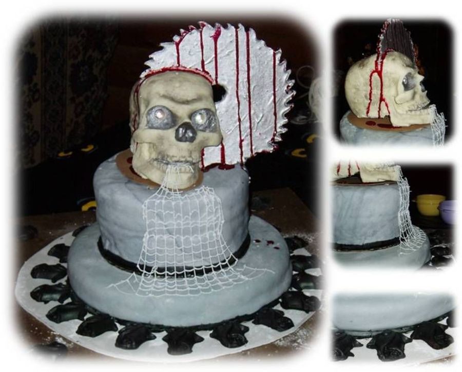 The skull and saw blade are three seperate pieces of solid white chocolate that were glued together with more white chocolate and shaded with Luster Dust. The eyes were drilled out with a power drill to place the small LED lights. The black roses are also white chocolate. To make the blood, we used corn syrup colored with petal dust. The spider web was piped using royal icing drop strings. Unfortunately a childs finger found the web before i was able to get the pictures taken; parts of the web are broken.