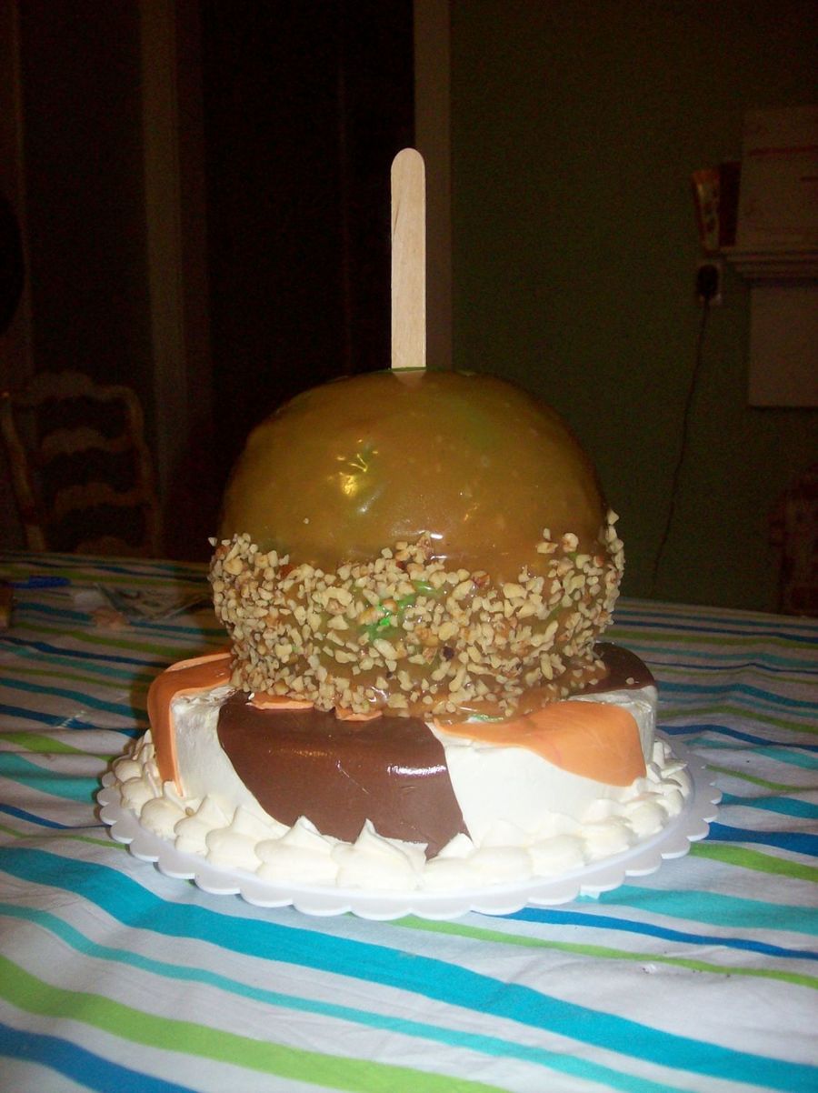 The bottom cake is iced in buttercream with fondant brown and orange leaves. The top cake was iced in buttercream with a caramel icing covering that and then patted on nuts.