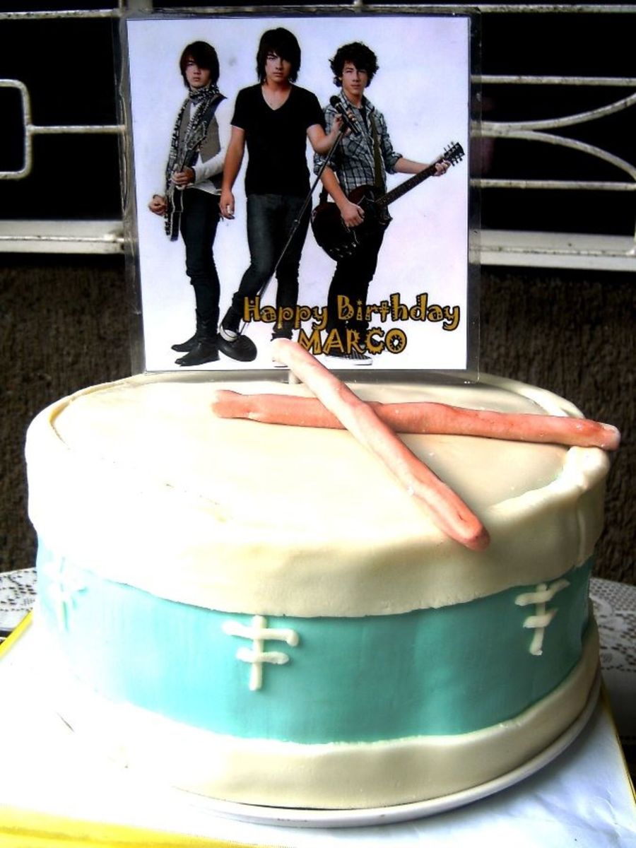 Made this for my nephew. He requested Jonas Brothers and he loves to play the drums. He is only 3 years old. This is my second fondant covered cake. Still having trouble with it though but I just need more practice. Inspired by the drum cakes I've seen on here. The jonas Brothers picture is obviously just a picture that I stuck on there. Thanks for looking! oooh! Thanks to jammjenks for the picture idea!