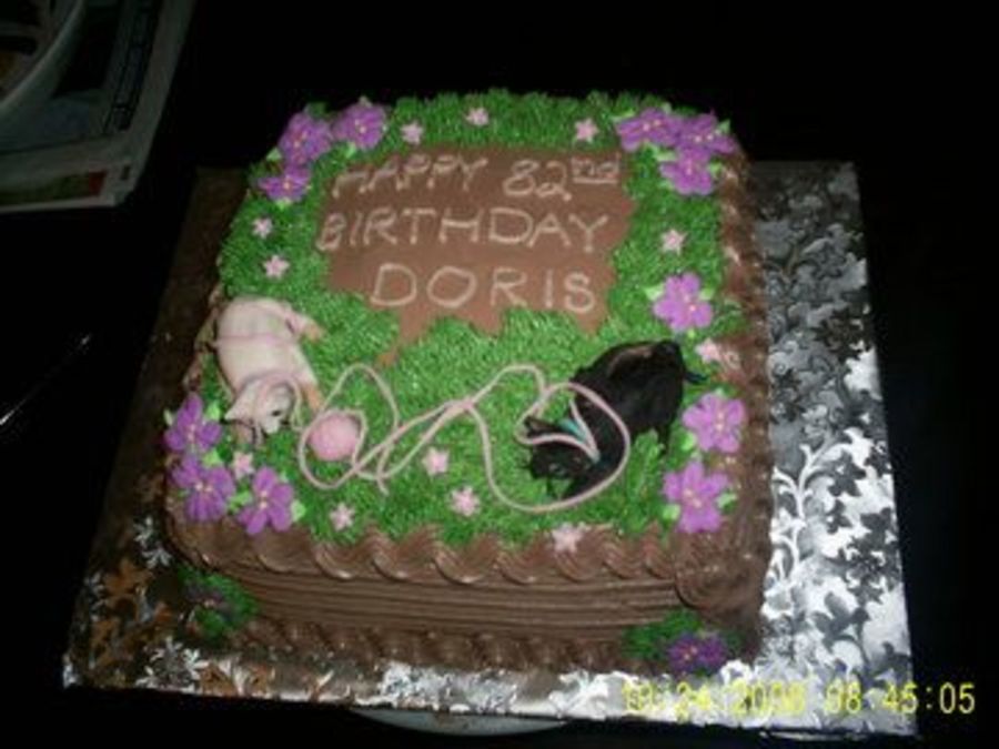 82nd birthday cake chocolate fudge with chocolate mousse, and chocolate buttercream. cats are made of fondant as well as yarn