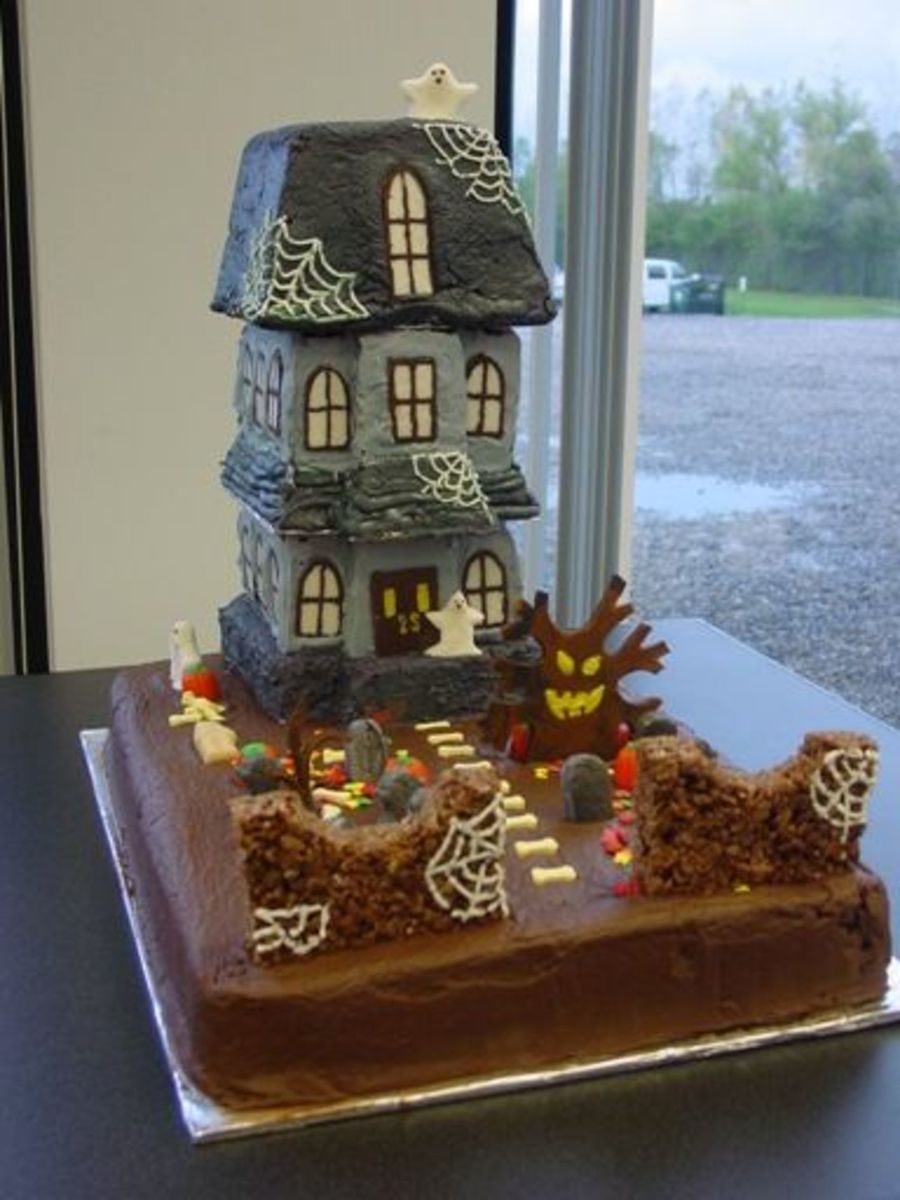I sketched this cake out and promised I was going to build it this year. There are 3 types of cakes involved. The base cake is Chocolate. The house is made of a marbled cake, and the roof is a Yellow Butter cake. All BC frosting The doors and Windows are made of chocolate. The tombstones and trees are made of Fondant. I marbled white and black fondant to make the tombstones. I purchased candies for accents. The front gate is made on Cocoa Rice Krispies.