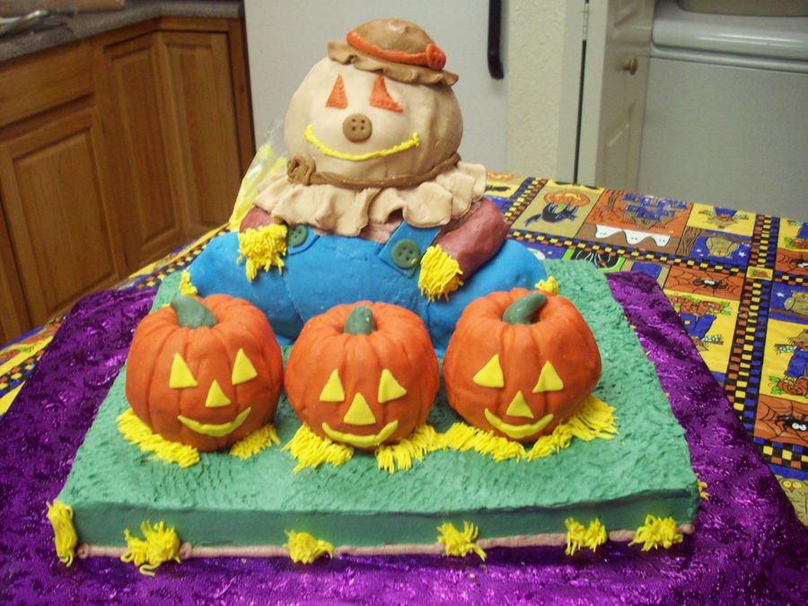 The scarecrow and pumpkins are covered in fondant. Ther base is covered in buttercream. The cake was a big hit at my husband's ship kids fall fest.