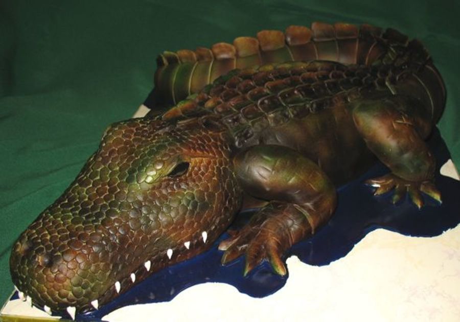 This was a grooms cake that I made at my PT job....found out about it 3 days before they needed it!! I carved the alligator from sheet cakes, legs are rice krispies...
