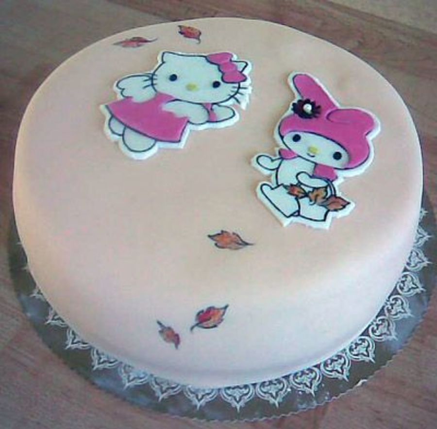 Hello kitty and My melody Chocolate cake filled with toffee, white chocolate cream, strawberrys, canache and whipped cream.