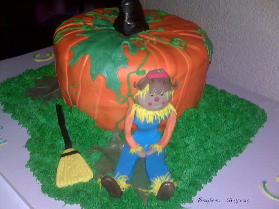 This was made for a three year's birthday party which was a costume party. The cake was marbled choc/yellow iced with butter cream and covered with fondant. The stem, scarecrow, and leaves are all fondant. The vines and grass are buttercream.