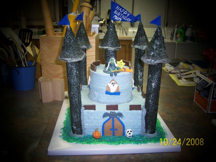 Cake is covered with buttercream icing. Turrets are made of cardboard and covered with royal icing and sanding sugar. Figures formed from fondant.