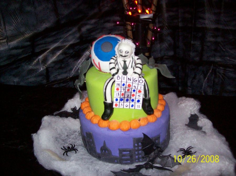 This is a cake I made for halloween/step-dad birthday/aunt birthday. My step dad was beetlejuice and my aunt was a bingo card. Figure is made from gumpase and all other decorations are fondant.