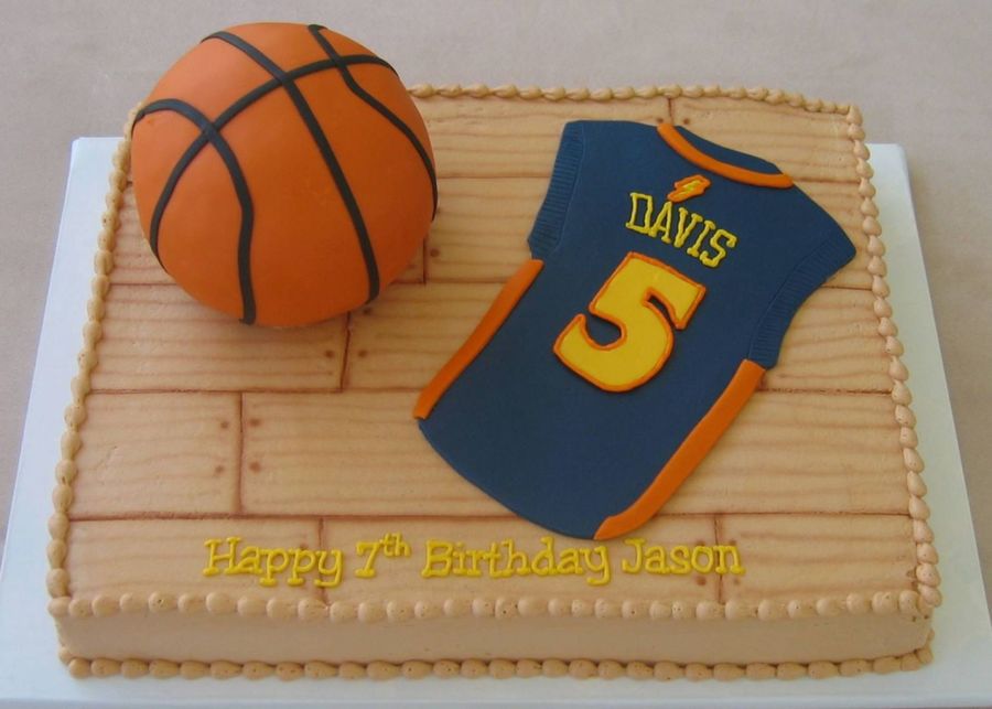 Buttercream iced cake, fondant jersey and fondant covered rice krispy treat basketball
