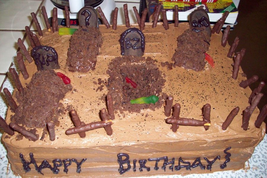 Last minute request for a graveyard. 11x17 chocolate fudge cake with mocha buttercream. The fence is dark chocolate candy coated pretzel sticks. The headstones are Chocolate Mint Milano cookies. Lots of fun to make.