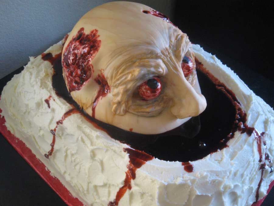 For adult Halloween party the theme being Dante's inferno. They wanted a head coming out of a pool of blood. Was a red velvet cake with cream cheese frosting. Head was sculpted cake covered in fondant.