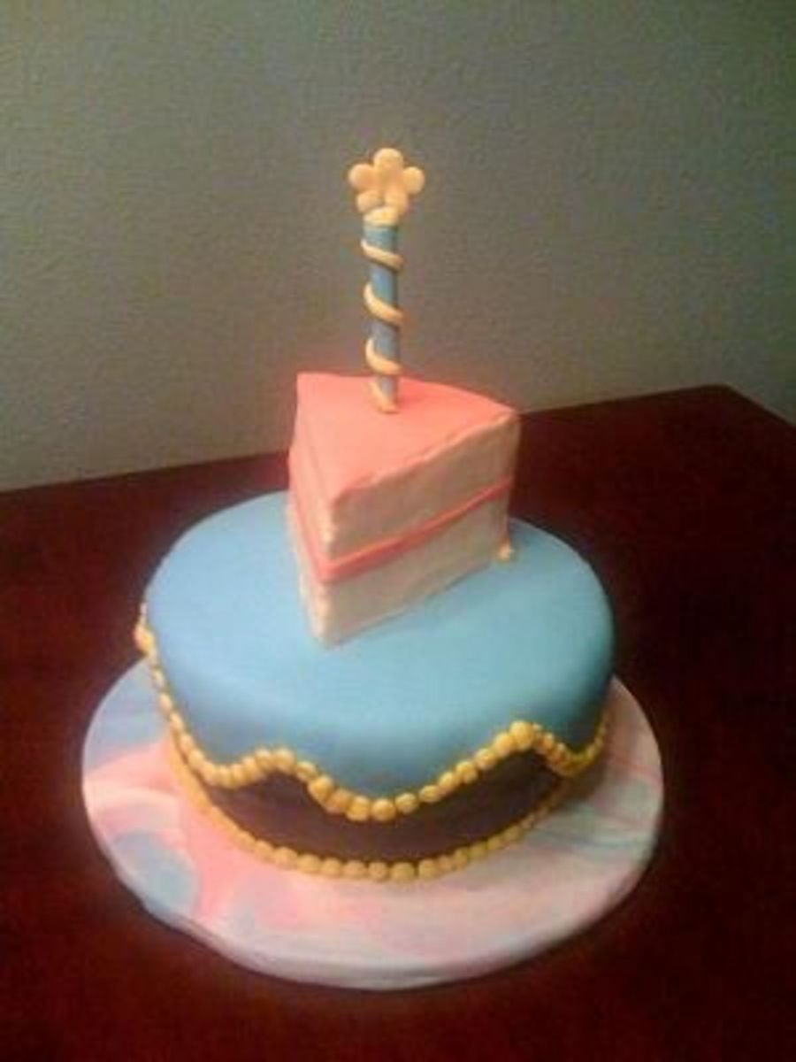 my little girl's 1st birthday cake, buttercream with fondant, rk treat slice on top, she ate two slices!