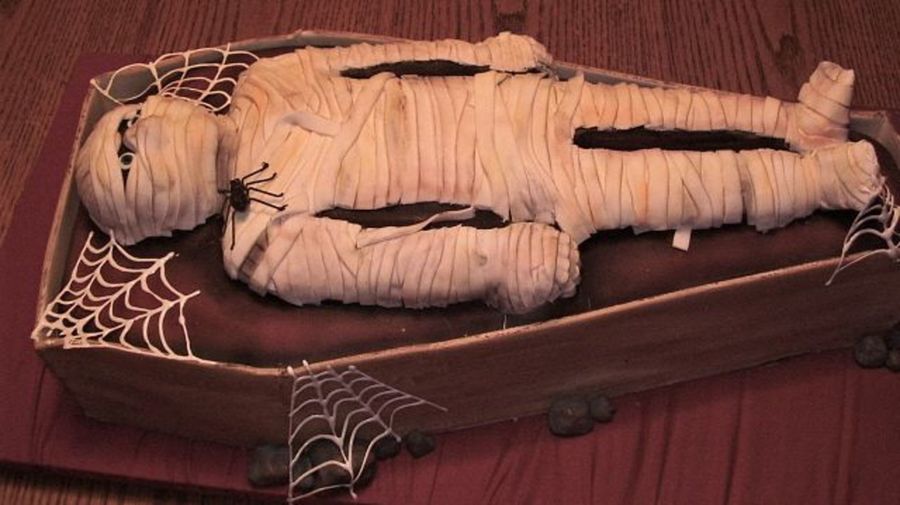 Made for DH's work. Modeling chocolate box, fondant covered mummy cake and sugar veil webs