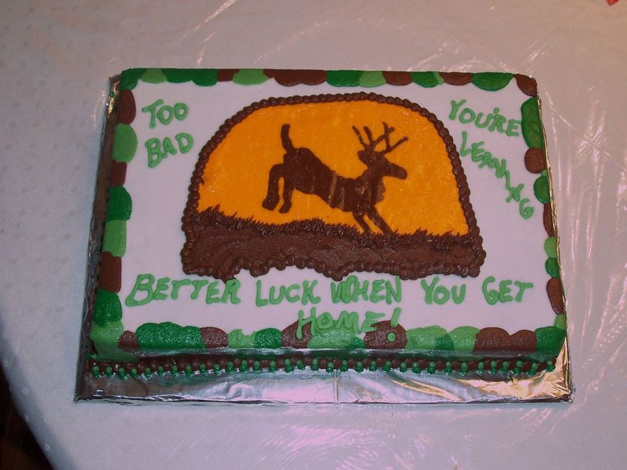 This cake was made for a going away party. Recipient of cake is a hunter, so the customer asked for a deer on the cake with camouflage colors. I put a camouflage pattern around the sides of the cake.