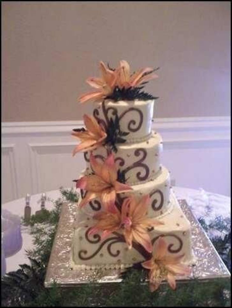this is beige buttercream w/ chocolate scrolls and fresh flowers thanks for looking!