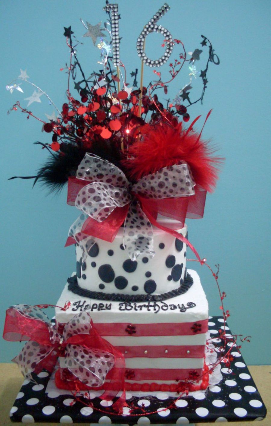 This is for a sweet 16 birthday. She didn't want anything to big, because it only needed to feed 20...She also wanted black and red with polka dots. Hopefully she will like it....Thanks for looking