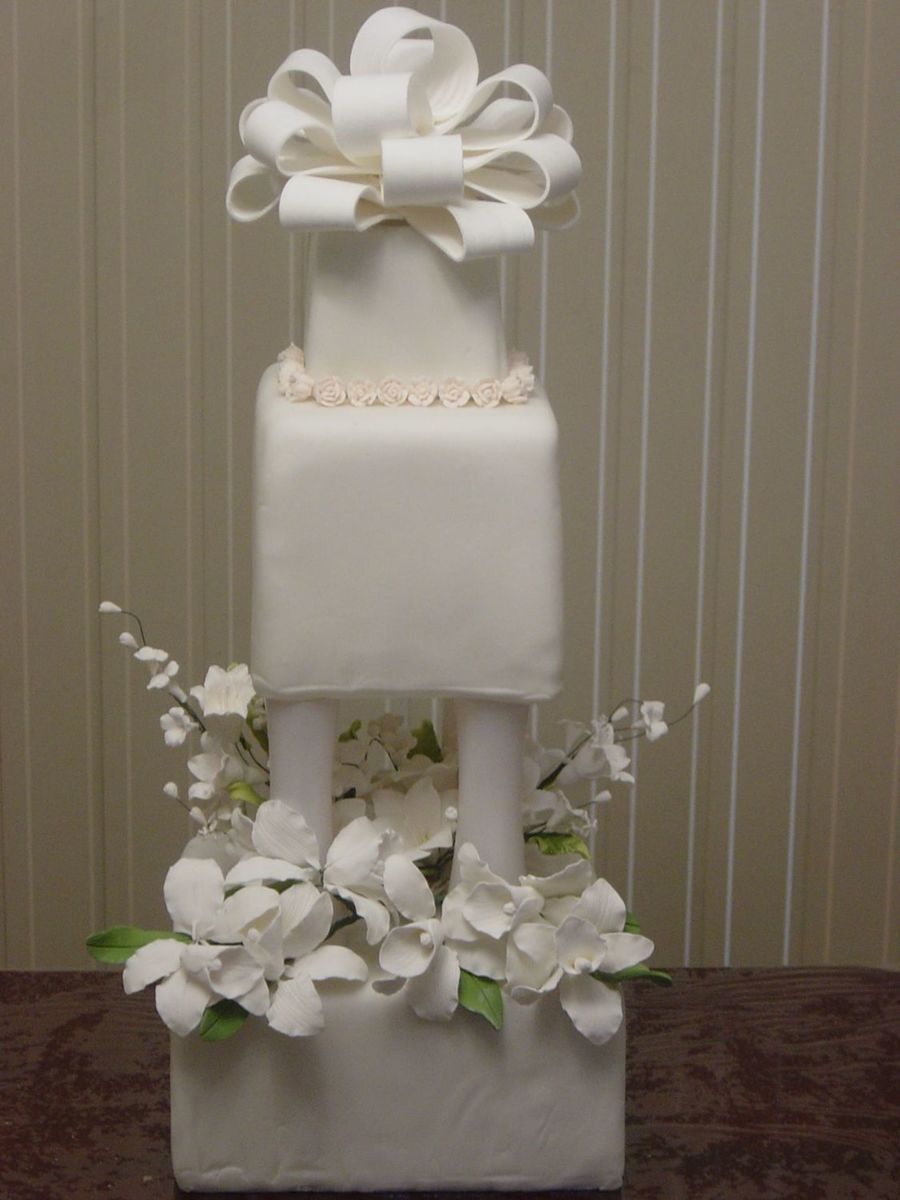 This is a fondant covered cake with gumpaste flowers and bow on top.
