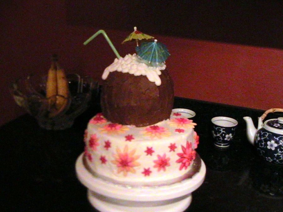 This is a cake I did for fun for a birthday at my hubby's work. I got the idea from a fellow member (sorry I can't remember the name, but thanks). It is coconut cake and coconut BC the flowers are fondant cut outs and the umberllas are the little paper ones for drinks.