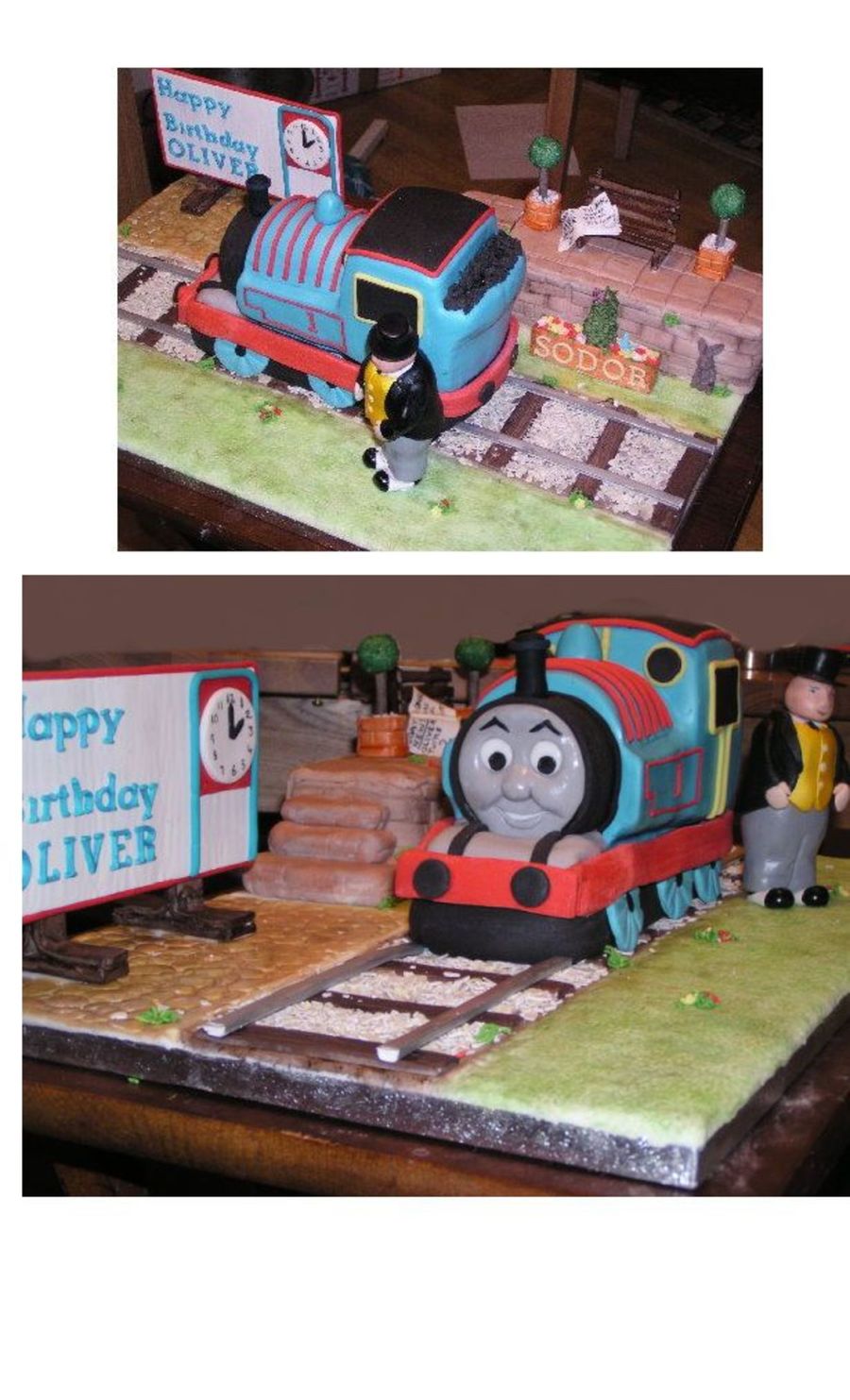 Another attempt at Thomas... Fondant covered sponge Thomas and platform. Fondant covered board with sugarpaste face, rails, sign, bench, flowers ,Fat Controler etc