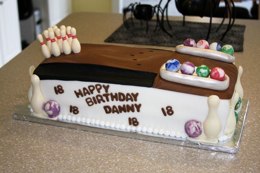 Cake made for my 18 year-old nephew's birthday. This was my first attempt at those candy mold things....the pins were candy as were the balls/pins at the corners. The cake was covered in fondant. The balls and ball holder thing is fondant too. The gutters were cut out, frosted and covered in black fondant. Time consuming cake but he liked it so it was worth it. The more I look at the photo the more I realize I should go back to "Cake Leveling 101"....holy goodness, talk about a rounded top!
