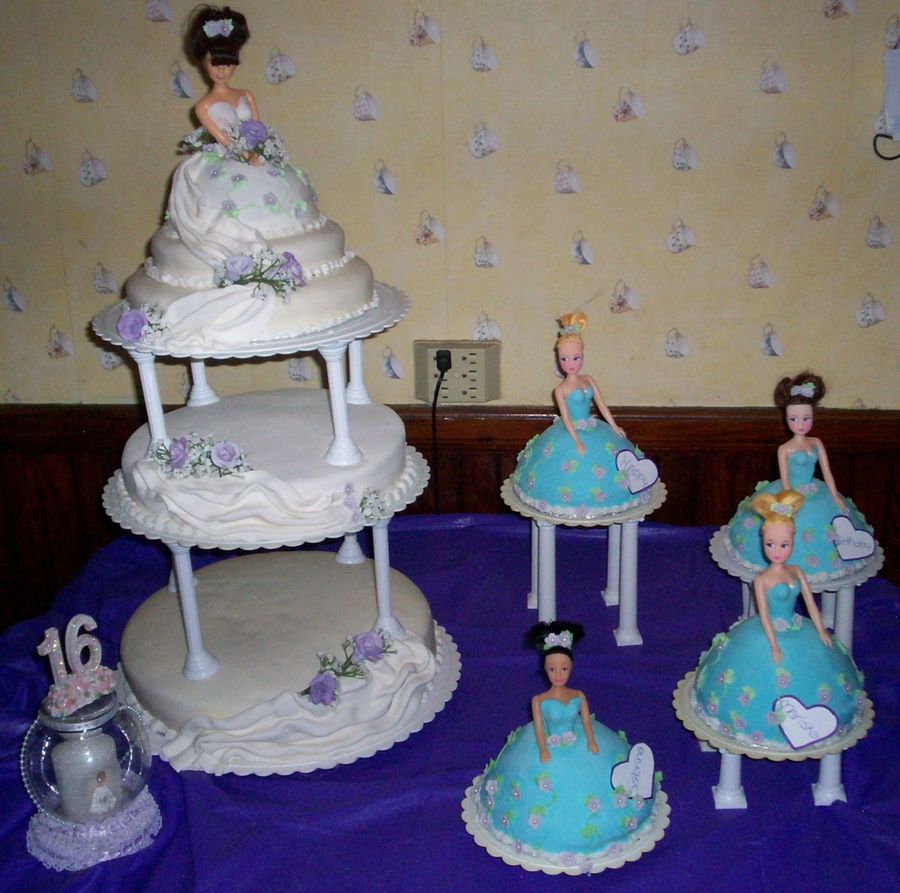 This is covered in marshmallow fondant. The flowers are gumpaste, except the baby's breath. The cakes were chocolate and some were yellow. I made this for my daughter's best freind 16th birthday.