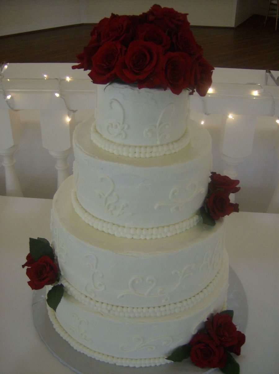 I picked up all three of Sharon Zambito's cake decorating vidoes and was able to make this wedding cake after watching the buttercream and wedding cake DVDs. If you are still struggleing with bulges and uneveness, I highly recommend her videos. Tier sizes are 16", 14", 10", and 6". Chocolate cake with chocolate mousse filling. Iced with buttercream.