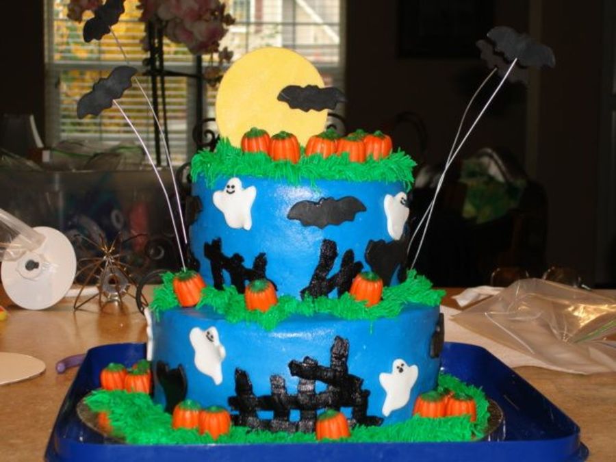 I made this cake last minute thank goodness for CC and the great decorators on here with great ideas. Really couldn't get a good pic of it, but everything is fondant except the pumpkins which are those candy corn pumpkins and the moon was a gp/fondant mix.