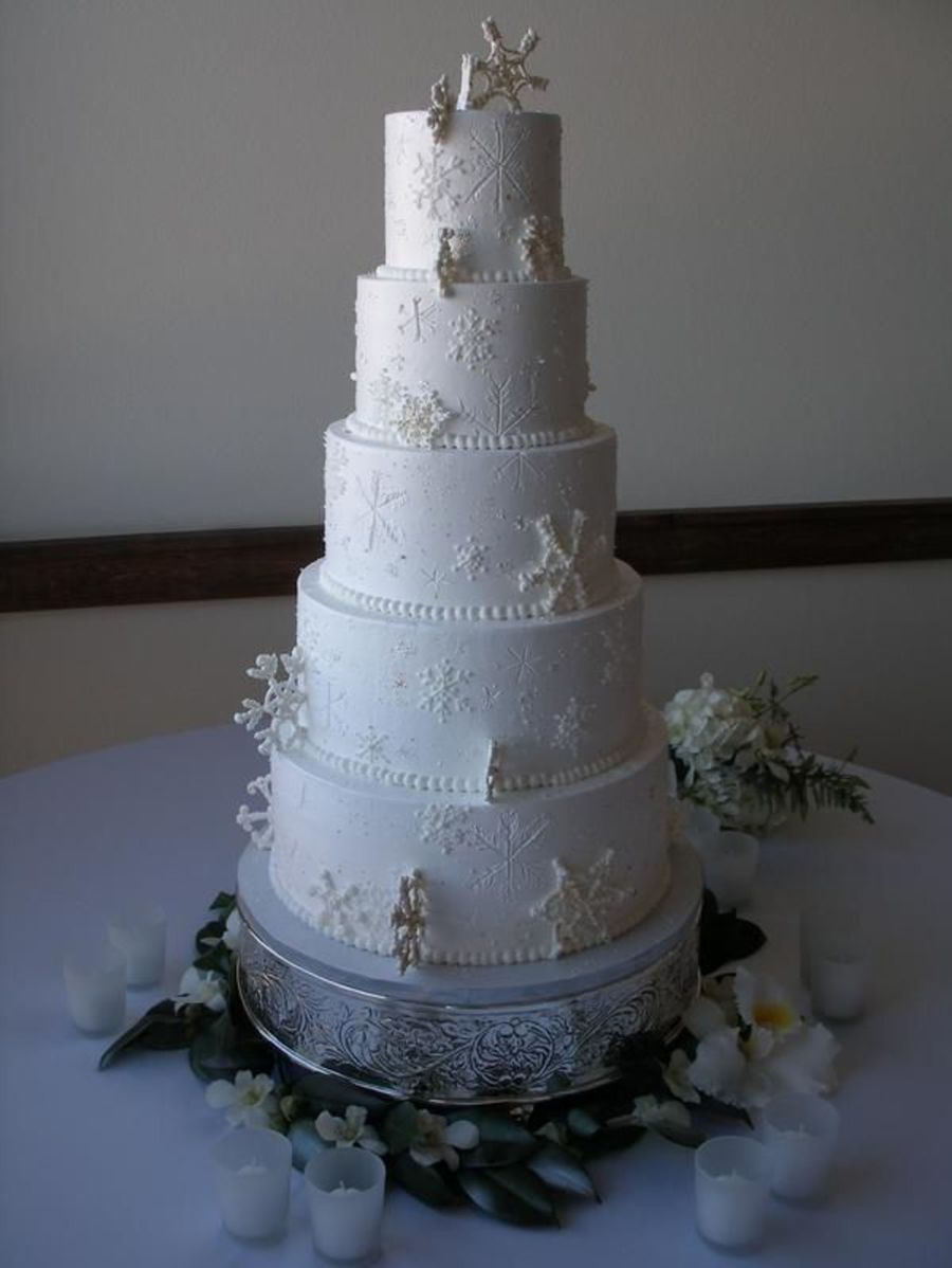 This was smoothly iced with a whipped vanilla icing. It's decorated with edible gold and silver flakes, snowflakes embossed into the surface of the icing, snowflakes piped on to the surface of the cake, as well as premade royal icing snowflakes.