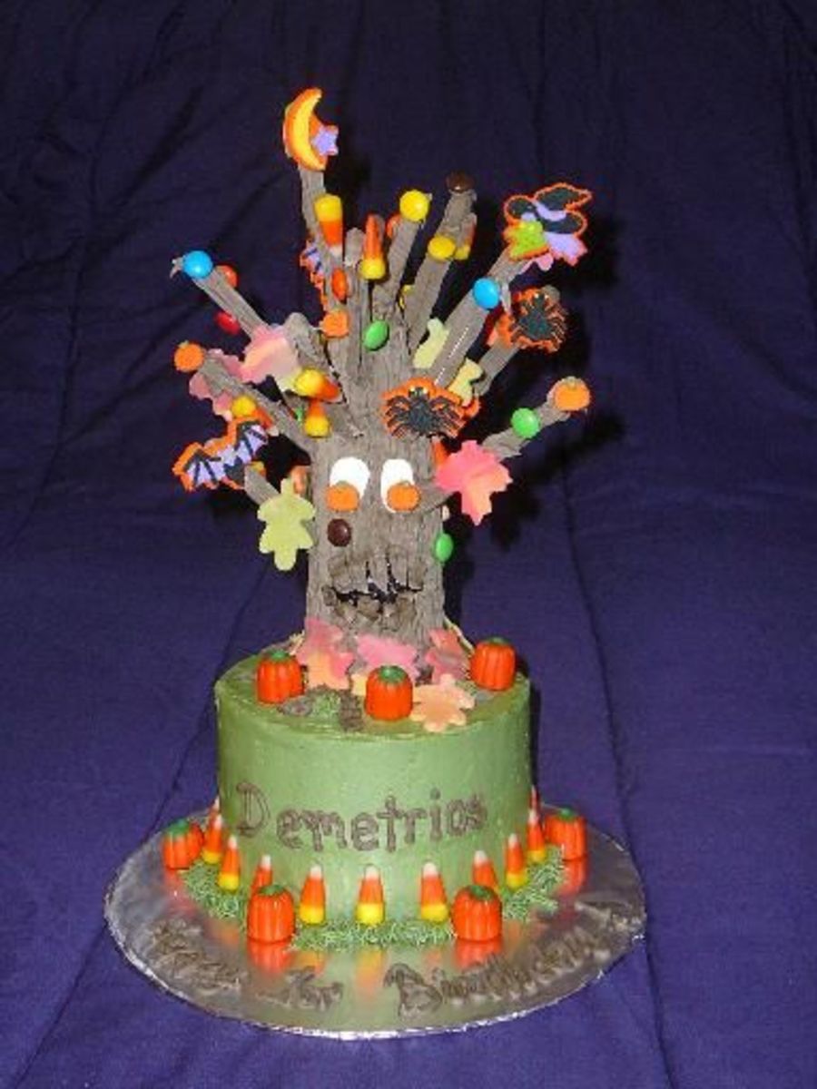 This one is my take on an idea from another CC'er. A friend of mine saw it on here and wanted one for her son's first birthday at home! (We did another cake for his first birthday party a couple days afterwards). It turned out to be really cute and she and her family loved it!!! The bottom is a 6" marbled cake with BC icing. The tree is made of Styrofoam with skewers for the branches all covered in royal icing, which is what was also used to attach all the candies that are in the branches.