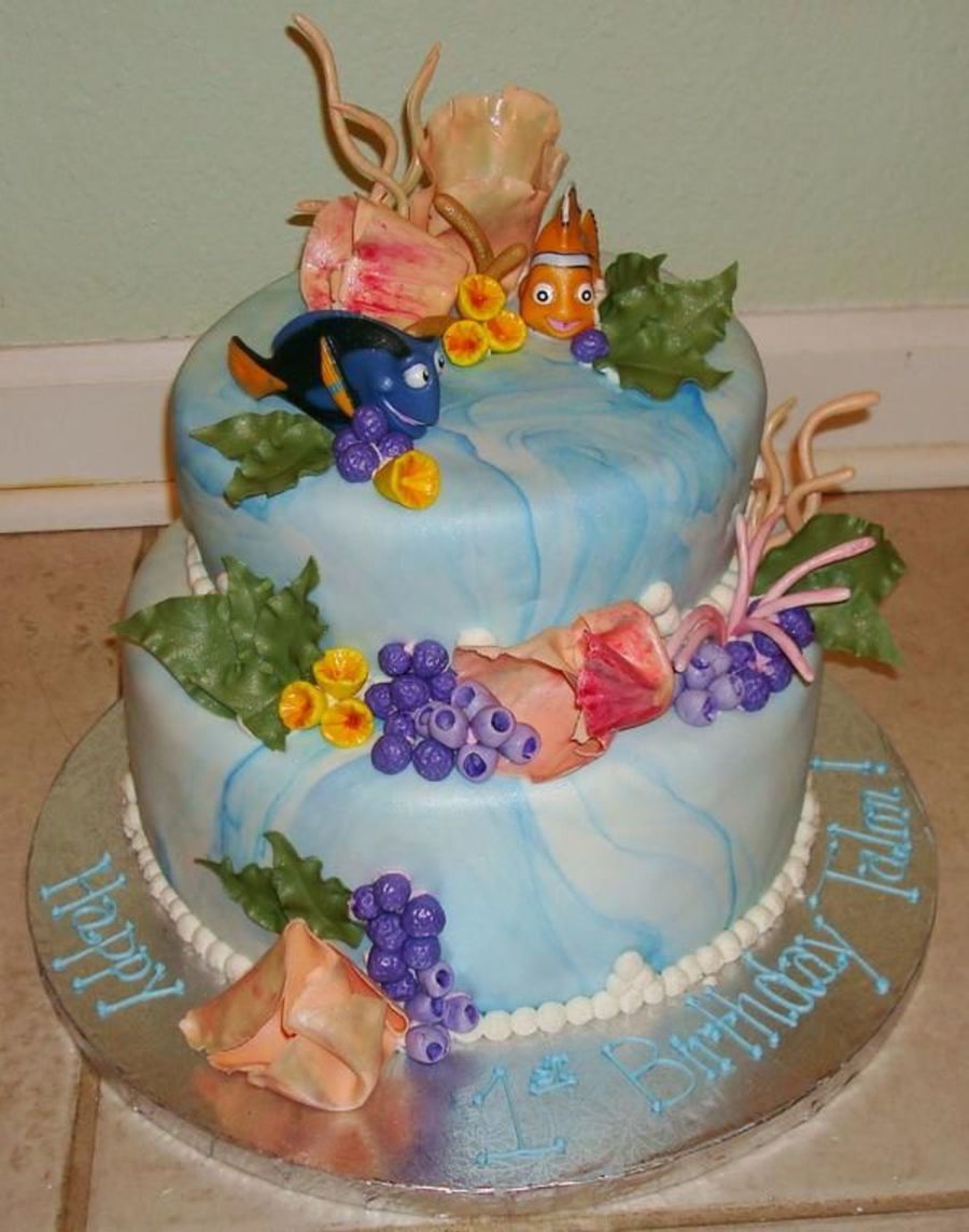 This is a 8" and 10" round tiered cake, covered in marbled white and blue fondant. And all the coral is made out of gumpaste.