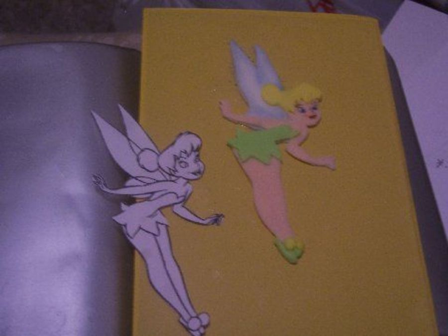 I made this Tinkerbell for a story book birthday cake that's coming up in a couple weeks. I printed out a coloring page and used it as my template to make my Tinkerbell out of fondant icing. I will be adding her wand and fairy dust sprinkles when I put her on the cake...it was a lot of work, but the end results was so worth my efforts...