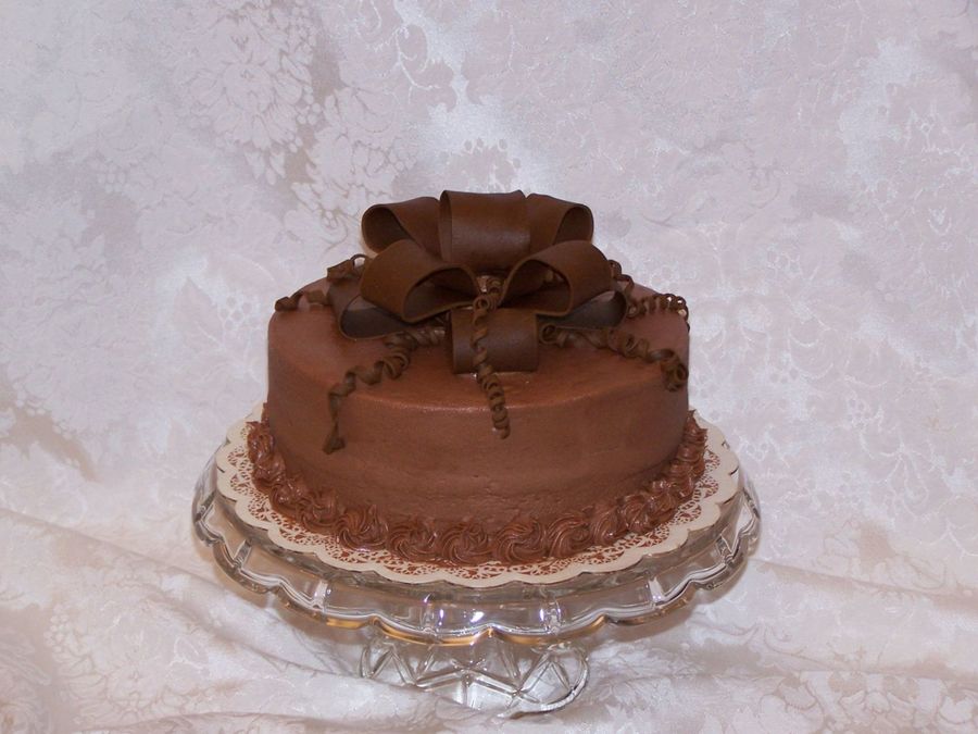 8 inch round chocolate cake. Brown fondant bow.