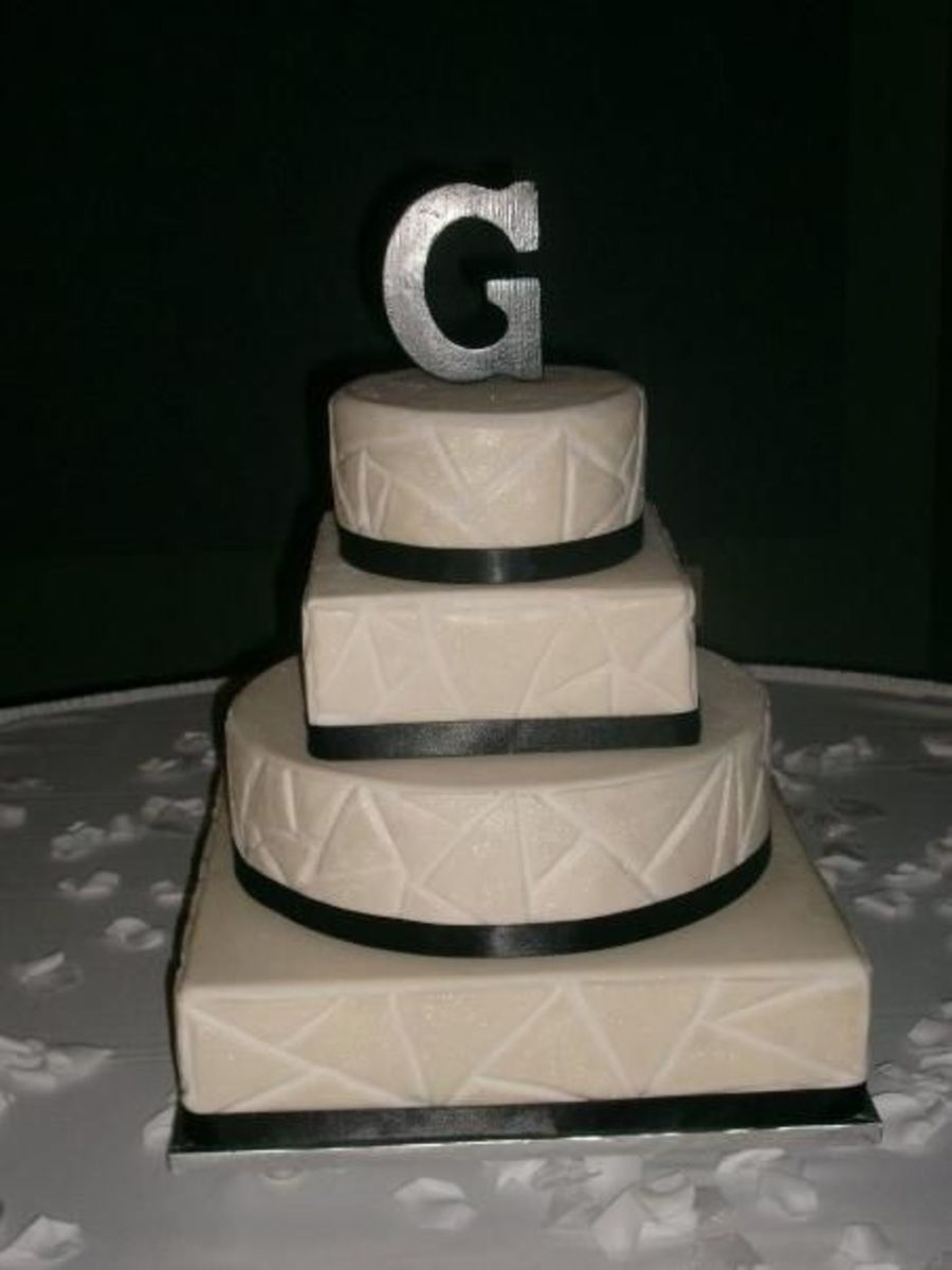 The bride saw a picture online of a cake that looked like tile and that is what she wanted. The cake is covered in buttercream with irregular shaped fondant pieces placed on it to look like tile. Luster dust was then added to the tile to give it a glaze look.