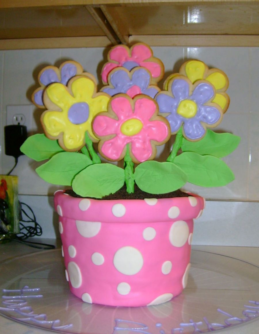 The Flower Pot is the actual cake (6 layers). The flowers are sugar cookies on skewers, the leaves are gumpaste. Pot is covered in MM fondant.