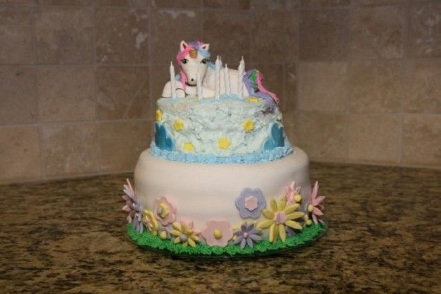 This cake was my third cake i've ever made. It was a White cake with strawberry cream cheese icing inside. The top layer was a regular royal icing and the bottom layer fondant. Also the layers once cut into the cake were rainbow colored... Purple Pink Green and Yellow :)
